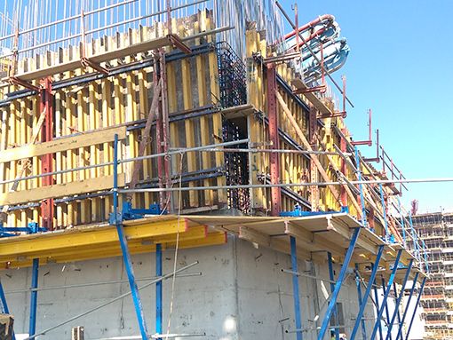 The formwork is firmly connected to the scaffolding and moved as a crane unit. It can also be used as a working scaffold only. The working platform consists of planking, platform beams, and two fixed climbing brackets.